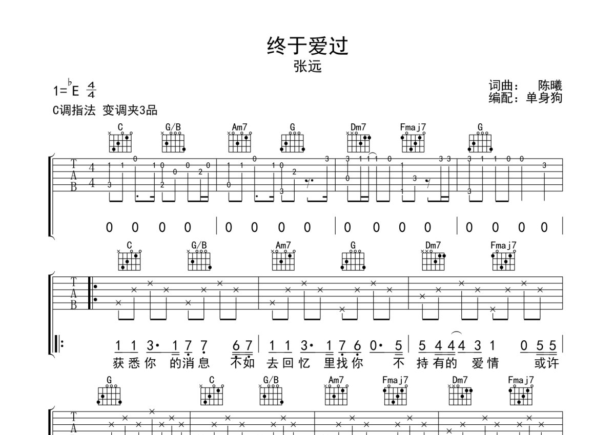 张远《终于爱过》吉他谱 - C调弹唱六线谱