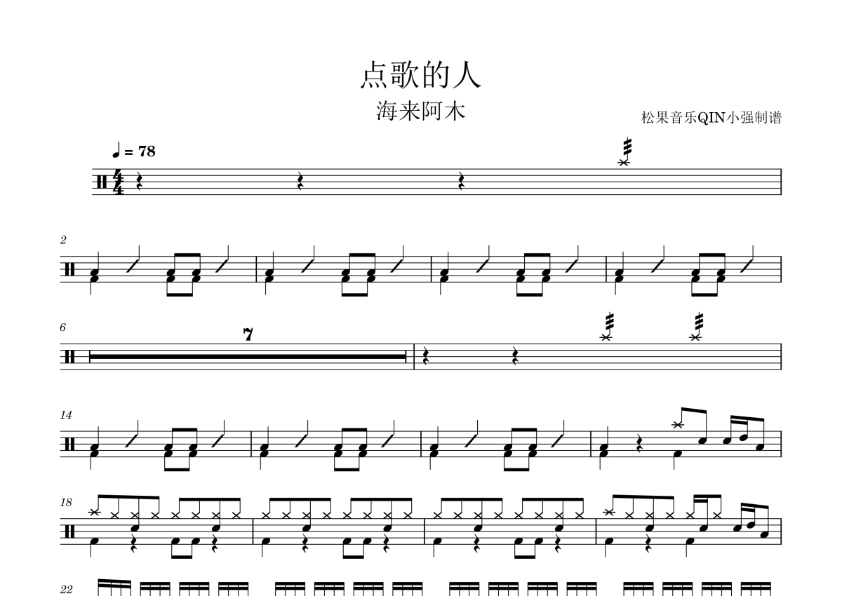 《点歌的人》是海来阿木演唱的一首歌曲,拍号为4/4拍,这份架子鼓谱共有两张高清图谱,图谱由 @松果音乐QIN小强 编配上传,图谱使用五线谱编配,使用这份点歌的人架子鼓谱,你将能够轻松地敲打出这首海来阿木的点歌的人,快来尝试吧。《点歌的人》是由海来阿木创作词曲并演唱的歌曲,于2020年3月21日以单曲形式发行。