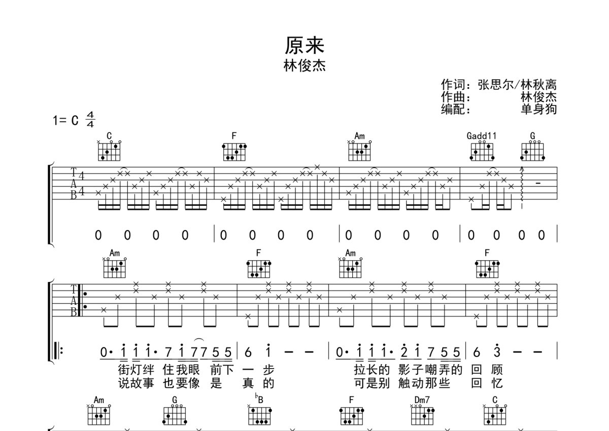 林俊杰《原来》吉他谱 - C调弹唱六线谱