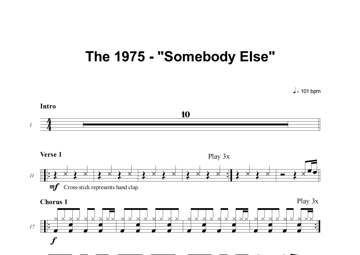 《Somebody Else》是The 1975演唱的一首歌曲,这份架子鼓谱共有三张高清图谱,图谱由 @举个例子 编配上传,图谱使用五线谱编配,使用这份Somebody Else架子鼓谱,你将能够轻松地敲打出这首The 1975的Somebody Else,快来尝试吧。