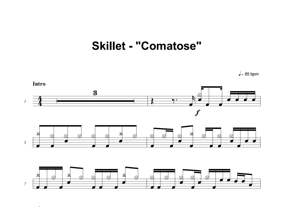 《Comatose》是Skillet演唱的一首歌曲,这份架子鼓谱共有五张高清图谱,图谱由 @举个例子 编配上传,图谱使用五线谱编配,使用这份Comatose架子鼓谱,你将能够轻松地敲打出这首Skillet的Comatose,快来尝试吧。