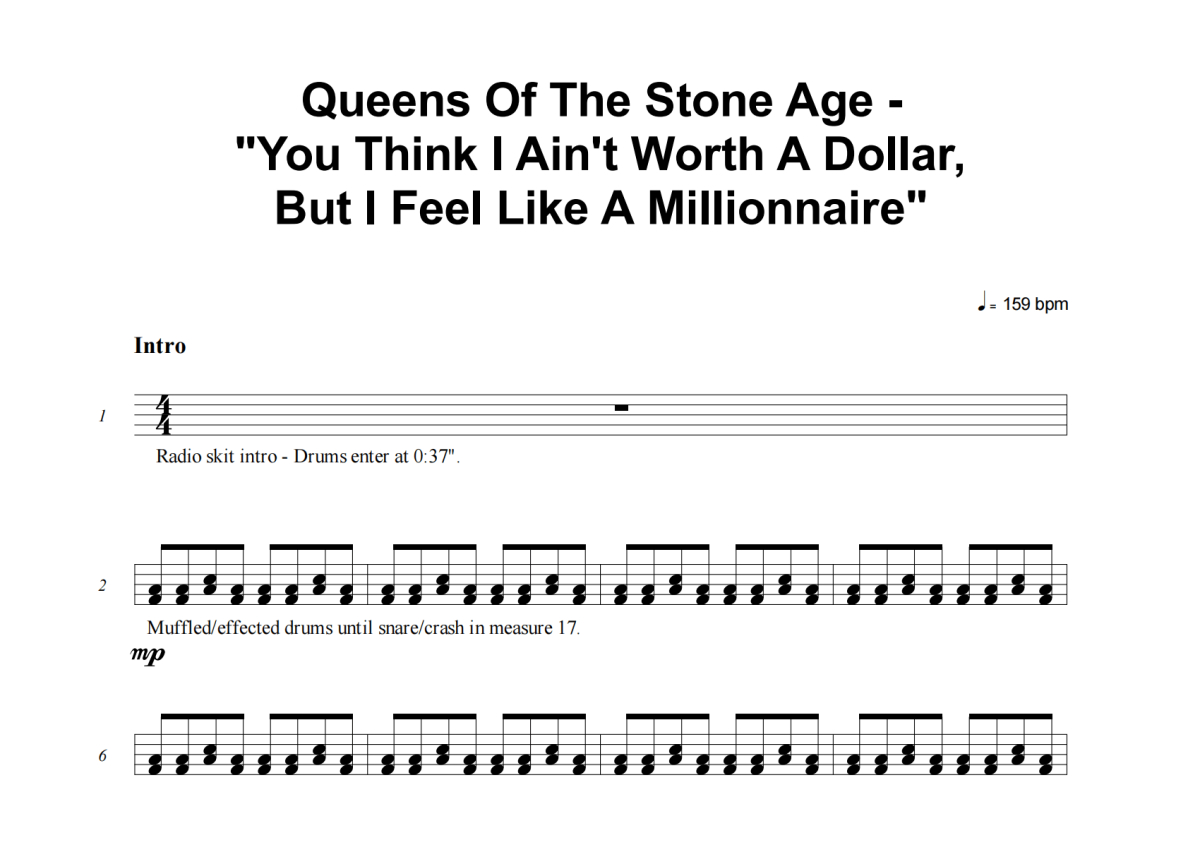 《You Think I Ain't Worth A Dollar, But I Feel Like A Millionaire》是Queens Of The Stone Age演唱的一首歌曲,这份架子鼓谱共有四张高清图谱,图谱由 @举个例子 编配上传,图谱使用五线谱编配,使用这份You Think I Ain't Worth A Dollar, But I Feel Like A Millionaire架子鼓谱,你将能够轻松地敲打出这首Queens Of The Stone Age的You Think I Ain't Worth A Dollar, But I Feel Like A Millionaire,快来尝试吧。