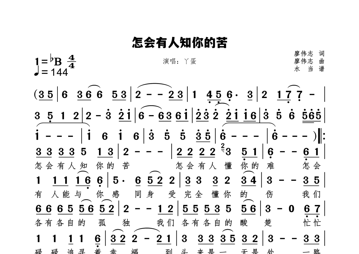 《怎会有人知你的苦》是丫蛋演唱的一首歌曲,拍号为4/4拍,歌曲速度为每分钟144拍,这份简谱共有一张高清图谱,图谱由 @水当 编配上传原调bB。