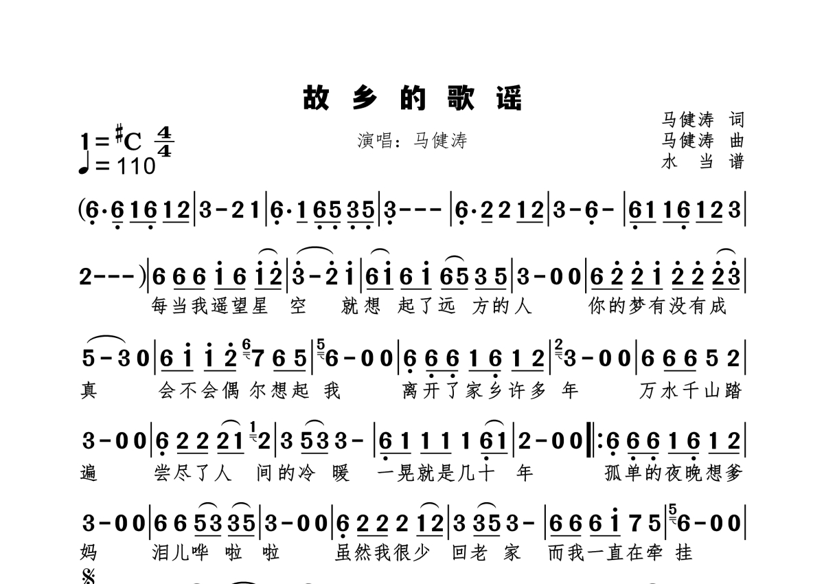 《故乡的歌谣》是马健涛演唱的一首歌曲,拍号为4/4拍,歌曲速度为每分钟110拍,这份简谱共有一张高清图谱,图谱由 @水当 编配上传原调#C。