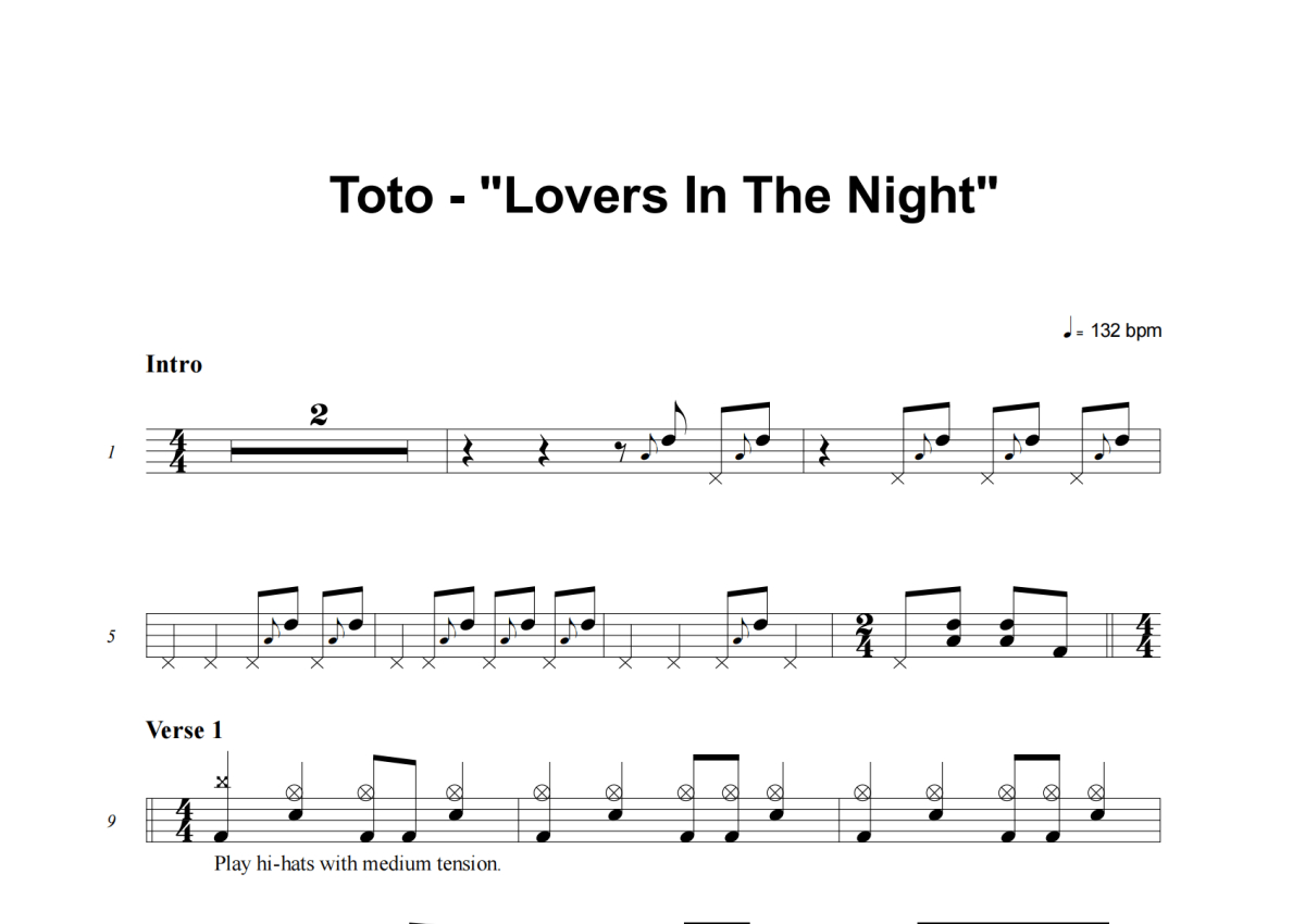 《Lovers In The Night》是Toto演唱的一首歌曲,这份架子鼓谱共有六张高清图谱,图谱由 @举个例子 编配上传,图谱使用五线谱编配,使用这份Lovers In The Night架子鼓谱,你将能够轻松地敲打出这首Toto的Lovers In The Night,快来尝试吧。