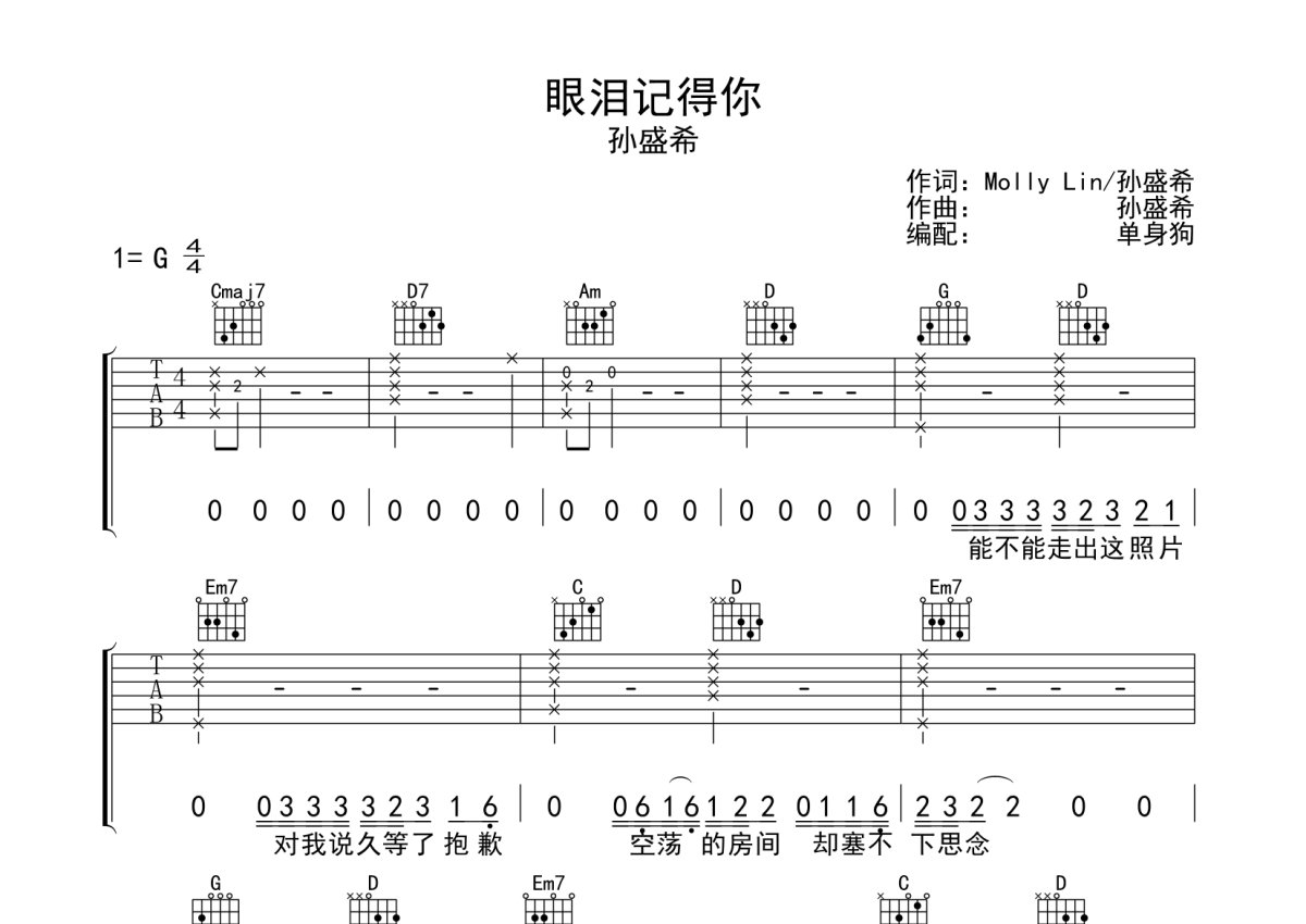 《眼泪记得你》是孙盛希演唱的一首歌曲,本吉他谱采用的是G调指法编配,这份吉他谱共有三张高清图谱,图谱由 @单身狗 编配上传,图谱使用六线谱编配,包含吉他和弦指法、简谱以及歌词部分,使用这份眼泪记得你吉他谱,可以让你更加方便地掌握这首歌曲的弹唱技巧,快来尝试吧。孙盛希《眼泪记得你》吉他弹唱谱,采用G调指法编配,单身狗编配出品,共有3张高清图谱。