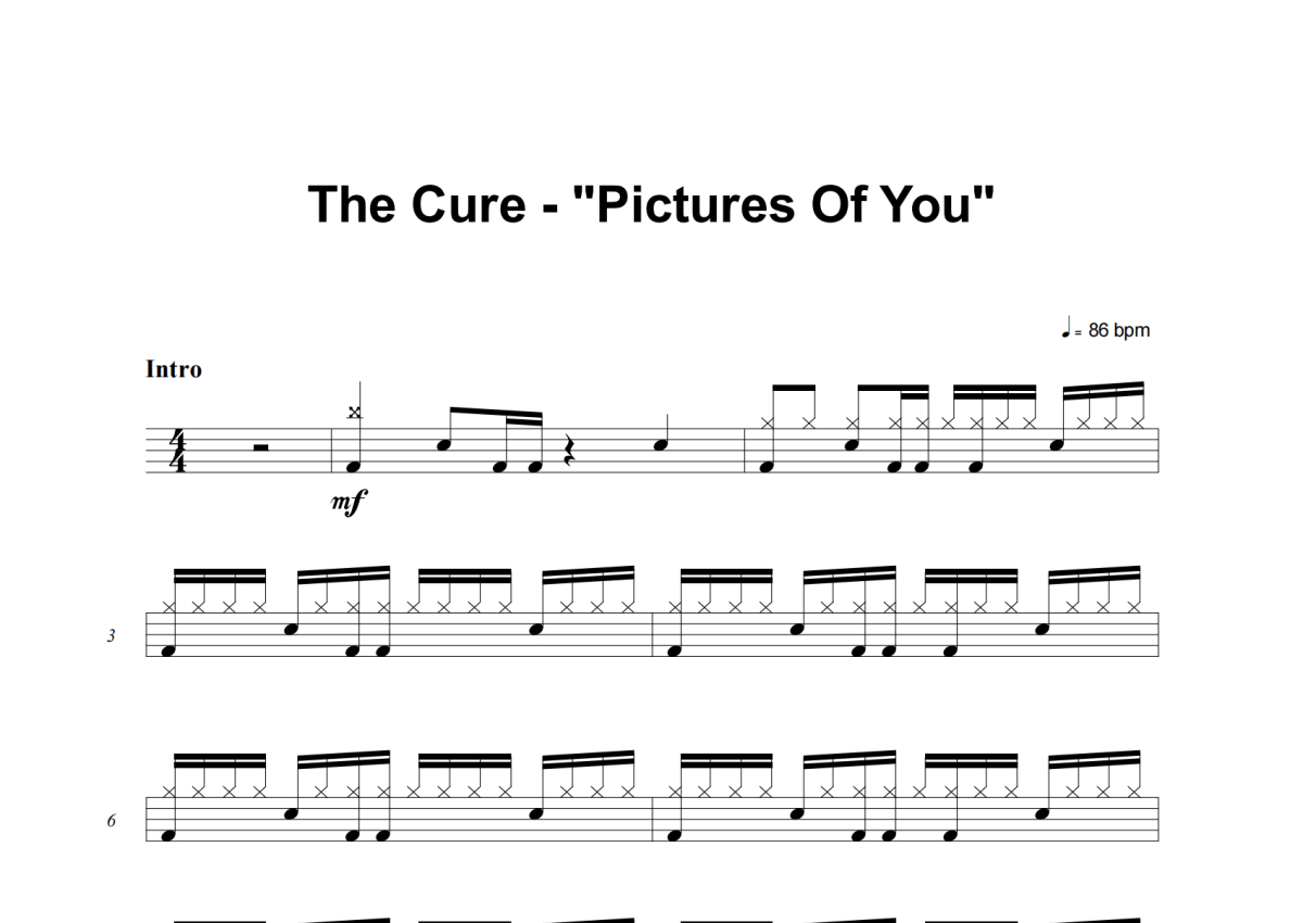 《Pictures Of You》是The Cure演唱的一首歌曲,这份架子鼓谱共有九张高清图谱,图谱由 @举个例子 编配上传,图谱使用五线谱编配,使用这份Pictures Of You架子鼓谱,你将能够轻松地敲打出这首The Cure的Pictures Of You,快来尝试吧。
