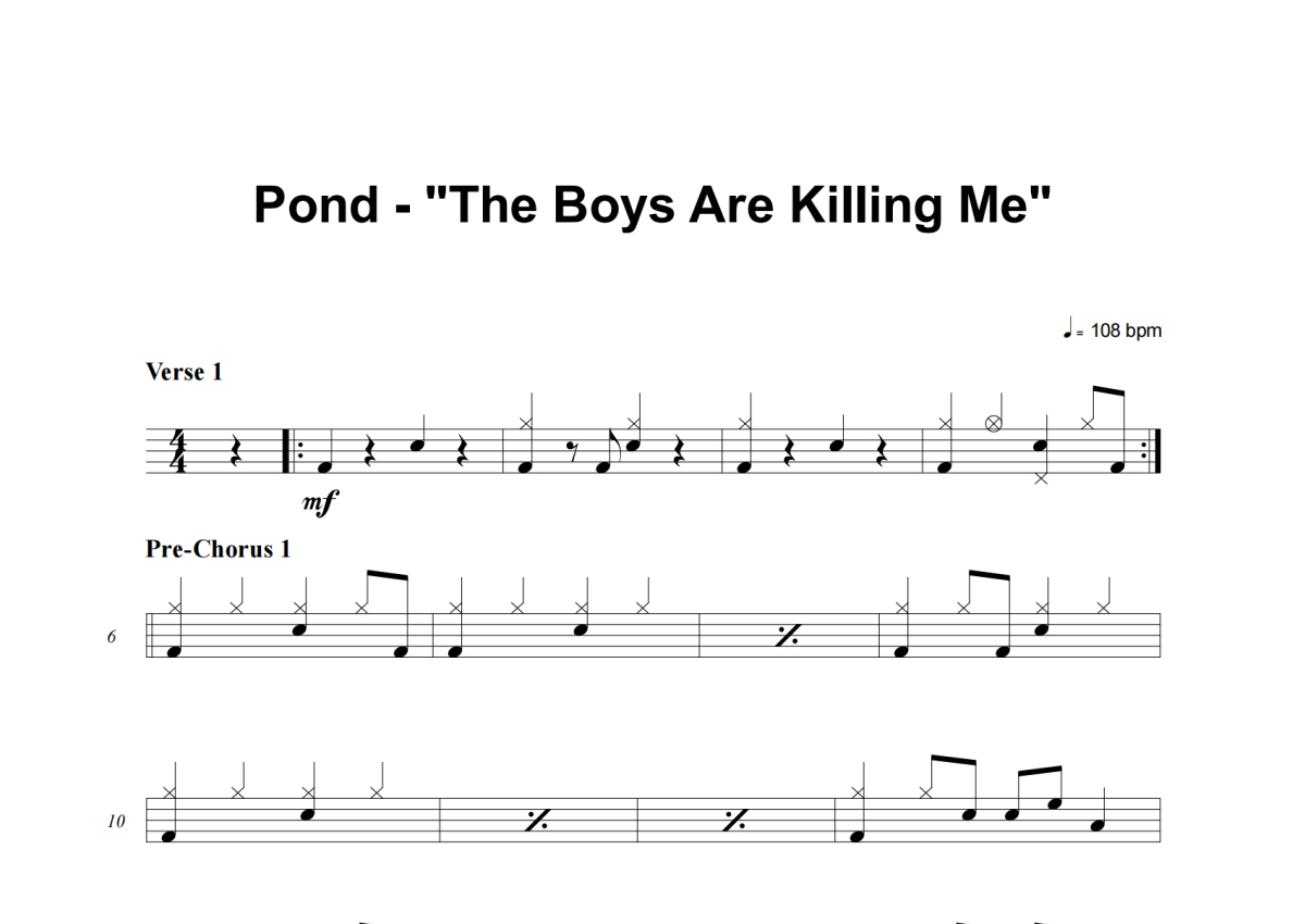《The Boys Are Killing Me》是Pond演唱的一首歌曲,这份架子鼓谱共有三张高清图谱,图谱由 @举个例子 编配上传,图谱使用五线谱编配,使用这份The Boys Are Killing Me架子鼓谱,你将能够轻松地敲打出这首Pond的The Boys Are Killing Me,快来尝试吧。