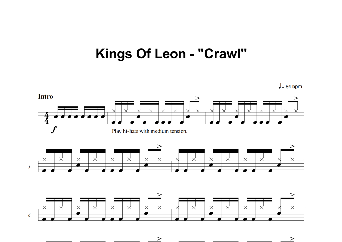 《Crawl》是Kings Of Leon演唱的一首歌曲,这份架子鼓谱共有五张高清图谱,图谱由 @举个例子 编配上传,图谱使用五线谱编配,使用这份Crawl架子鼓谱,你将能够轻松地敲打出这首Kings Of Leon的Crawl,快来尝试吧。