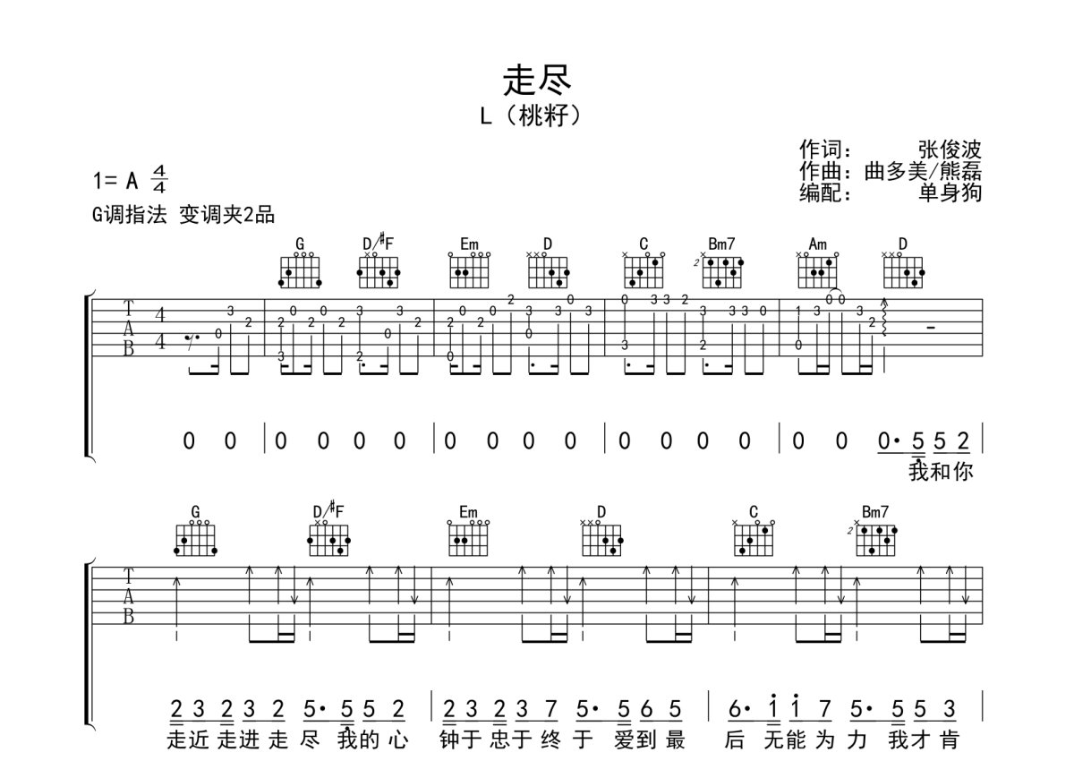 《走尽》是L(桃籽)演唱的一首歌曲,本吉他谱采用的是G调指法编配,这份吉他谱共有三张高清图谱,图谱由 @单身狗 编配上传,图谱使用六线谱编配,包含吉他和弦指法、简谱以及歌词部分,使用这份走尽吉他谱,可以让你更加方便地掌握这首歌曲的弹唱技巧,快来尝试吧。L(桃籽)《走尽》吉他弹唱谱,采用G调指法编配,单身狗编配出品,共有3张高清图谱。