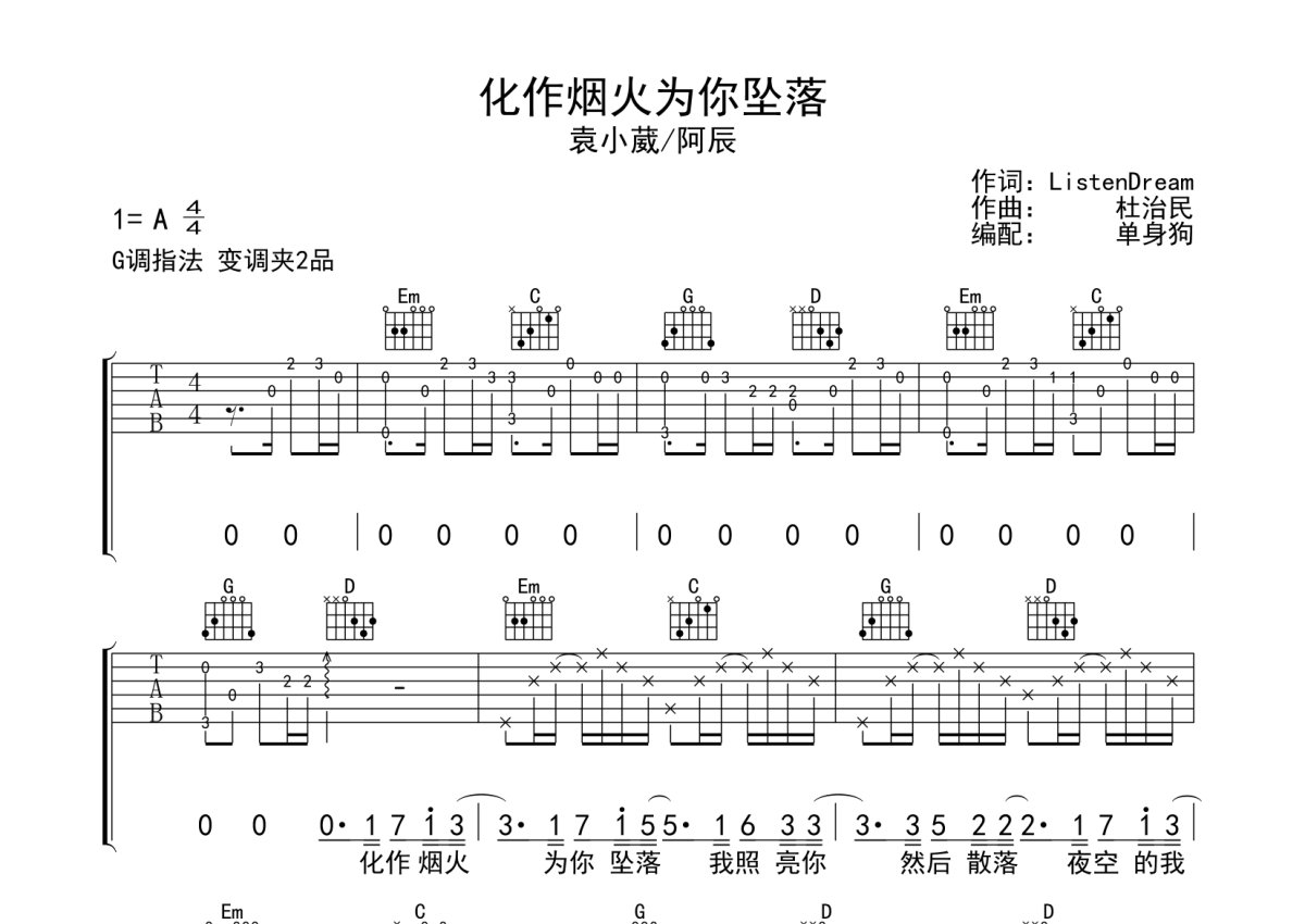 袁小葳/阿辰《化作烟火为你坠落》吉他谱 - G调弹唱六线谱