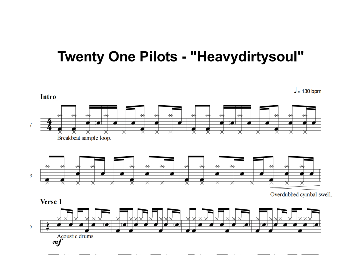 《Heavydirtysoul》是Twenty One Pilots演唱的一首歌曲,这份架子鼓谱共有四张高清图谱,图谱由 @举个例子 编配上传,图谱使用五线谱编配,使用这份Heavydirtysoul架子鼓谱,你将能够轻松地敲打出这首Twenty One Pilots的Heavydirtysoul,快来尝试吧。