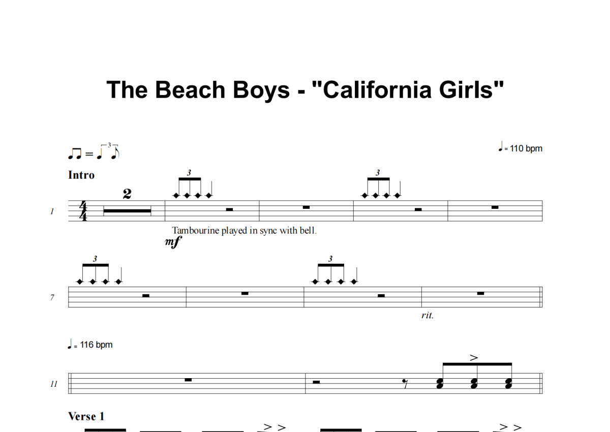 《California Girls》是The Beach Boys演唱的一首歌曲,这份架子鼓谱共有三张高清图谱,图谱由 @举个例子 编配上传,图谱使用五线谱编配,使用这份California Girls架子鼓谱,你将能够轻松地敲打出这首The Beach Boys的California Girls,快来尝试吧。