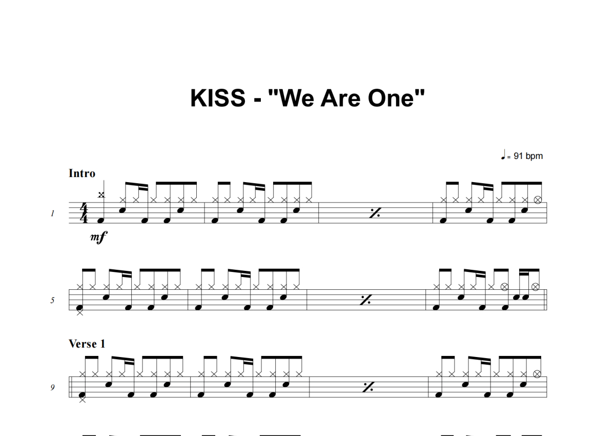 《We Are One》是KISS演唱的一首歌曲,这份架子鼓谱共有三张高清图谱,图谱由 @举个例子 编配上传,图谱使用五线谱编配,使用这份We Are One架子鼓谱,你将能够轻松地敲打出这首KISS的We Are One,快来尝试吧。