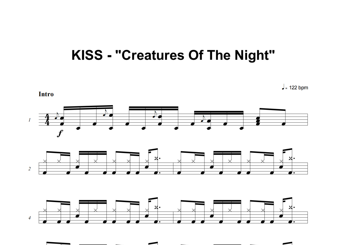 《Creatures Of The Night》是KISS演唱的一首歌曲,这份架子鼓谱共有七张高清图谱,图谱由 @举个例子 编配上传,图谱使用五线谱编配,使用这份Creatures Of The Night架子鼓谱,你将能够轻松地敲打出这首KISS的Creatures Of The Night,快来尝试吧。