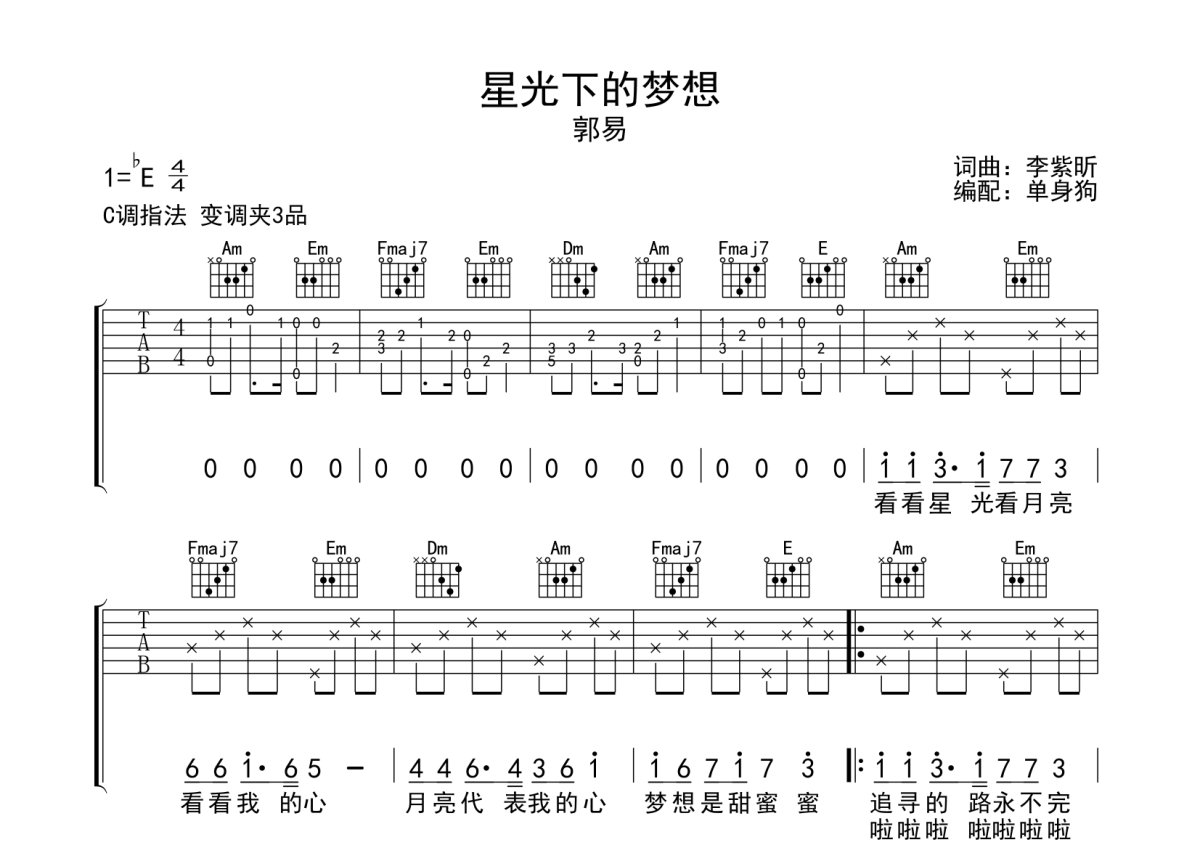 郭易《星光下的梦想》吉他谱 - C调弹唱六线谱