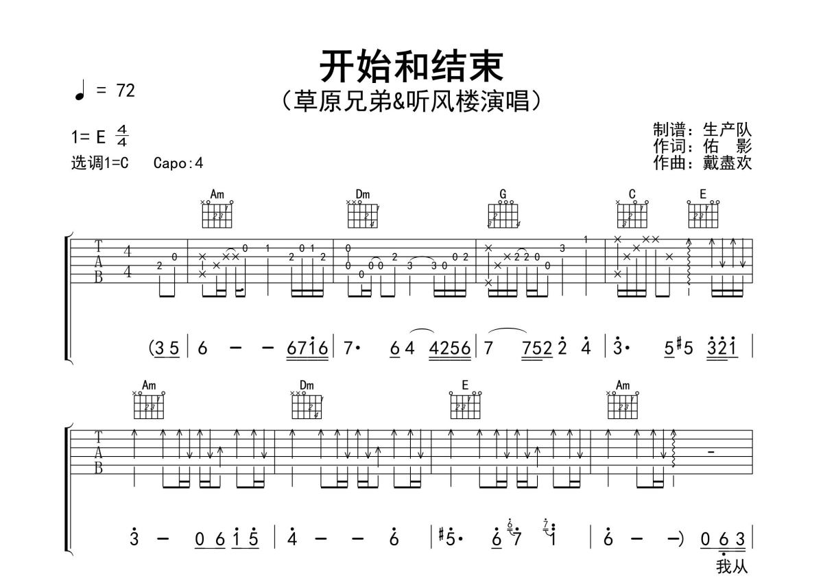 《开始和结束》是草原兄弟演唱的一首歌曲,精编完美版,拍号为4/4拍,歌曲速度为每分钟72拍,歌曲原调为E调,但由于原调指法比较难,为了方便弹奏,本吉他谱采用的是C调指法编配,变调夹4品弹奏即为原调,当然也可以根据自己的音域改变变调夹位置,或者通过改变和弦调性,以方便自己弹奏,这份吉他谱共有三张高清图谱,图谱由 @生产队 编配上传,图谱使用六线谱编配,包含吉他和弦指法、简谱以及歌词部分,使用这份开始和结束吉他谱,可以让你更加方便地掌握这首歌曲的弹唱技巧,快来尝试吧。草原兄弟&听风楼演唱的歌曲《开始和结束》原版吉他谱,含前奏、间奏、尾奏solo编配,精编完美版,值得推荐!。