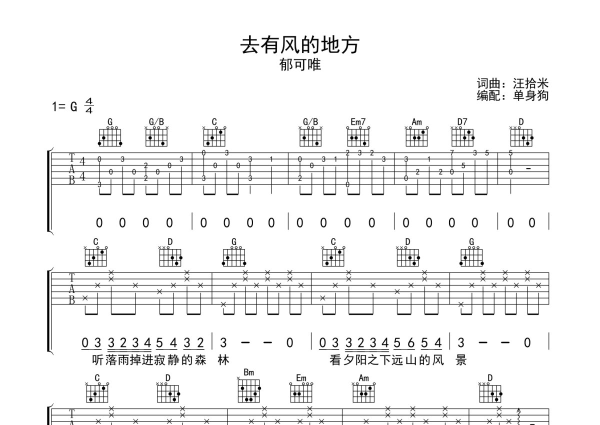 《去有风的地方》是郁可唯演唱的一首歌曲,本吉他谱采用的是G调指法编配,这份吉他谱共有两张高清图谱,图谱由 @单身狗 编配上传,图谱使用六线谱编配,包含吉他和弦指法、简谱以及歌词部分,使用这份去有风的地方吉他谱,可以让你更加方便地掌握这首歌曲的弹唱技巧,快来尝试吧。郁可唯《去有风的地方》吉他弹唱谱,采用G调指法编配,单身狗编配出品,共有2张高清图谱,免翻页排版设计。