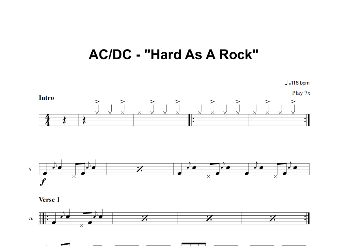 《Hard As A Rock》是AC_DC演唱的一首歌曲,这份架子鼓谱共有三张高清图谱,图谱由 @举个例子 编配上传,图谱使用五线谱编配,使用这份Hard As A Rock架子鼓谱,你将能够轻松地敲打出这首AC_DC的Hard As A Rock,快来尝试吧。