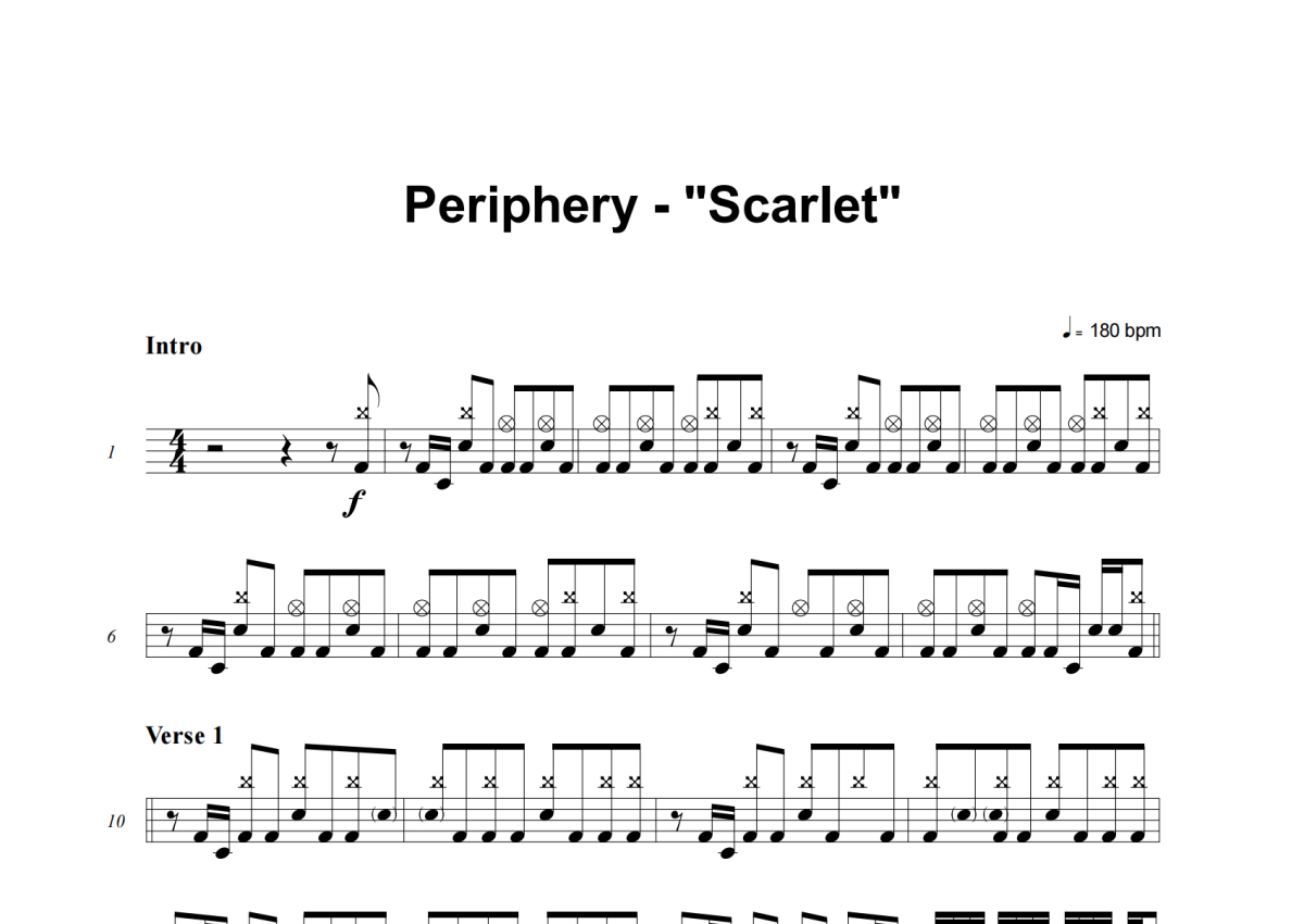 《Scarlet》是Periphery演唱的一首歌曲,这份架子鼓谱共有六张高清图谱,图谱由 @举个例子 编配上传,图谱使用五线谱编配,使用这份Scarlet架子鼓谱,你将能够轻松地敲打出这首Periphery的Scarlet,快来尝试吧。