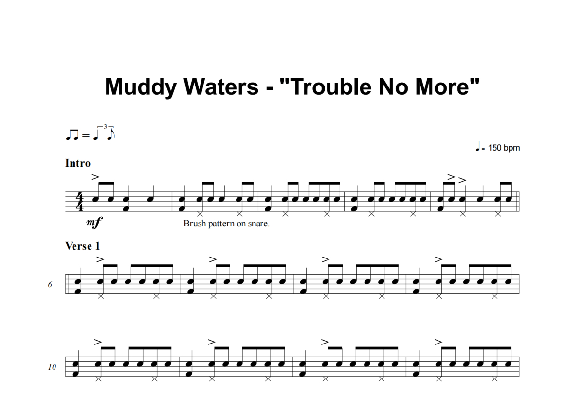 《Trouble No More》是Muddy Waters演唱的一首歌曲,这份架子鼓谱共有四张高清图谱,图谱由 @举个例子 编配上传,图谱使用五线谱编配,使用这份Trouble No More架子鼓谱,你将能够轻松地敲打出这首Muddy Waters的Trouble No More,快来尝试吧。