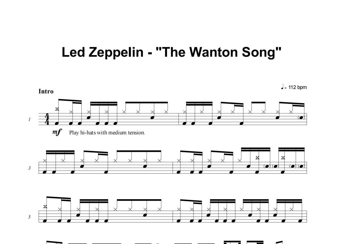 《The Wanton Song》是Led Zeppelin演唱的一首歌曲,这份架子鼓谱共有六张高清图谱,图谱由 @举个例子 编配上传,图谱使用五线谱编配,使用这份The Wanton Song架子鼓谱,你将能够轻松地敲打出这首Led Zeppelin的The Wanton Song,快来尝试吧。