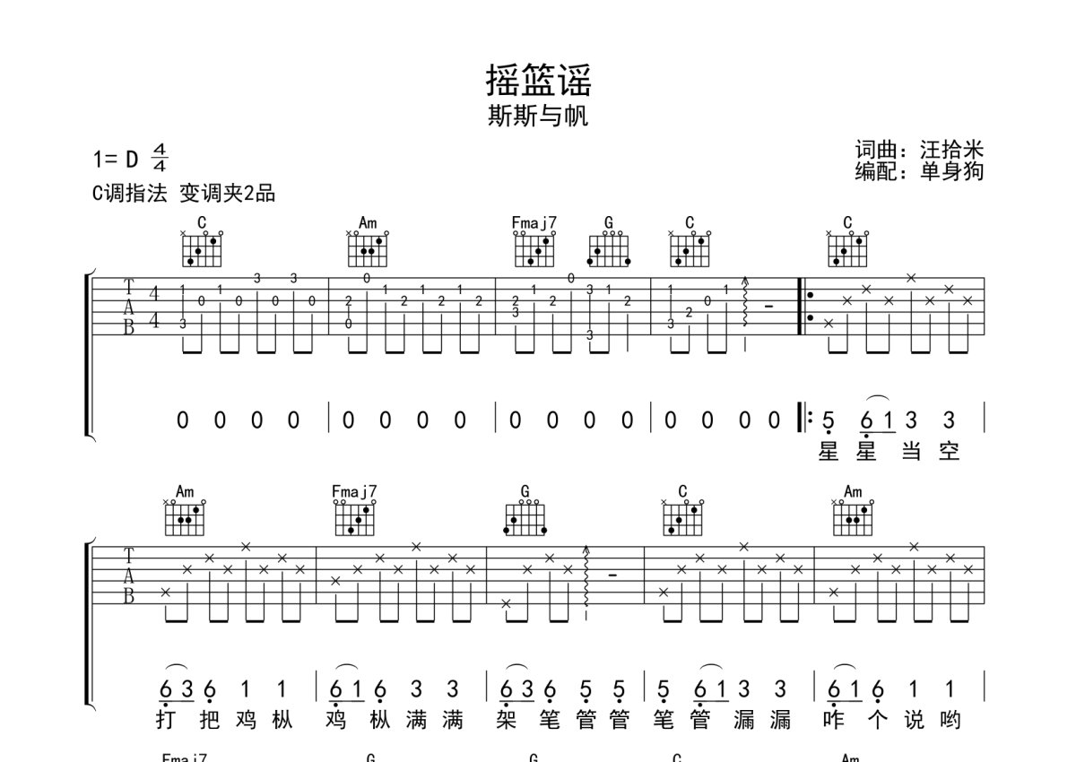 斯斯与帆《摇篮谣》吉他谱 - C调弹唱六线谱