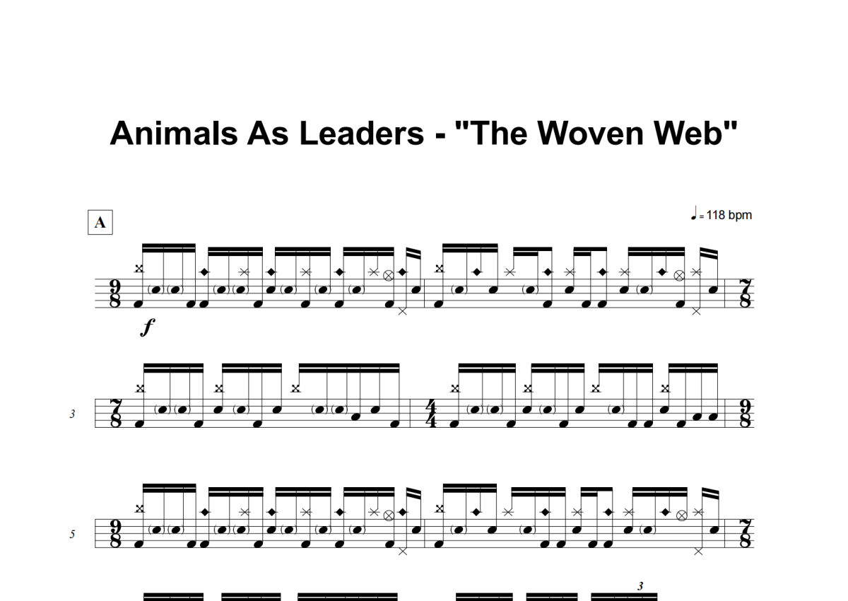 《The Woven Web》是Animals As Leaders演唱的一首歌曲,这份架子鼓谱共有六张高清图谱,图谱由 @举个例子 编配上传,图谱使用五线谱编配,使用这份The Woven Web架子鼓谱,你将能够轻松地敲打出这首Animals As Leaders的The Woven Web,快来尝试吧。