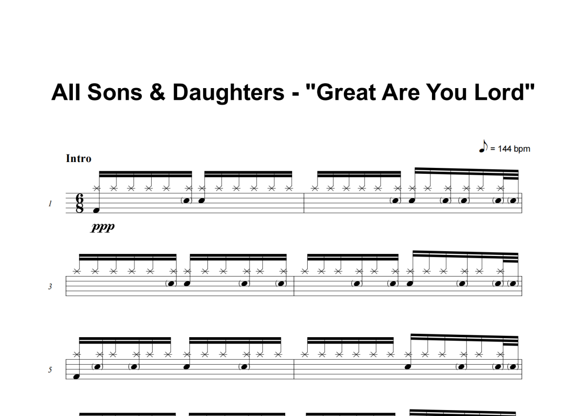 《Great Are You Lord》是All Sons & Daughters演唱的一首歌曲,这份架子鼓谱共有六张高清图谱,图谱由 @举个例子 编配上传,图谱使用五线谱编配,使用这份Great Are You Lord架子鼓谱,你将能够轻松地敲打出这首All Sons & Daughters的Great Are You Lord,快来尝试吧。