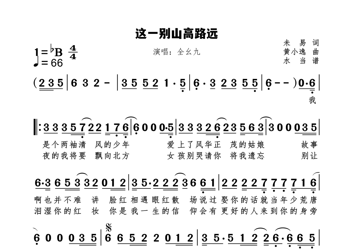 《这一别山高路远》是全幺九演唱的一首歌曲,这份简谱共有一张高清图谱,图谱由 @水当 编配上传原调bB。