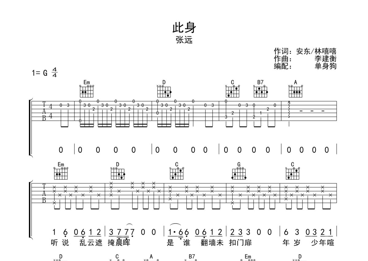 张远《此身》吉他谱 - G调弹唱六线谱