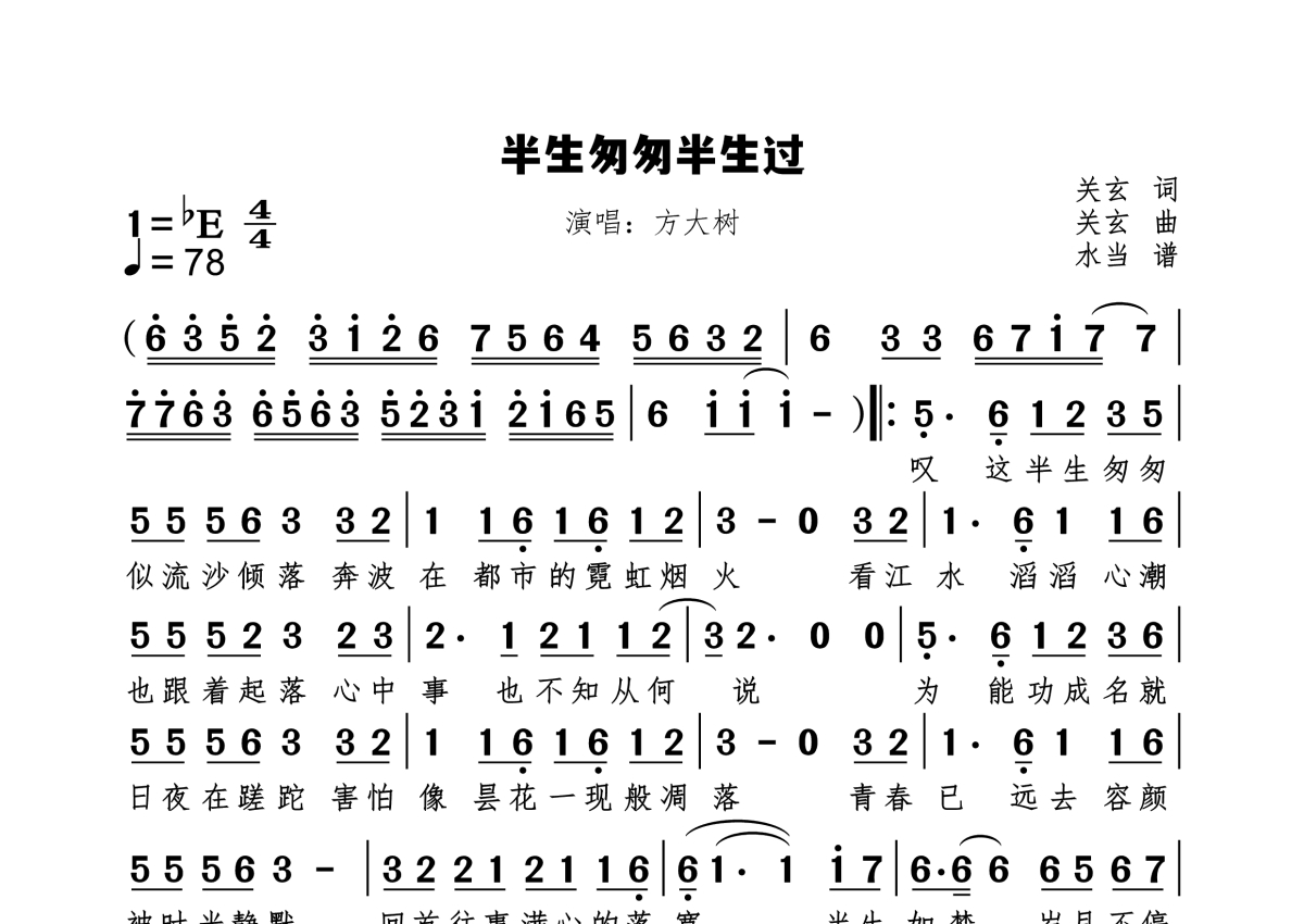 《半生匆匆半生过》是方大树演唱的一首歌曲,拍号为4/4拍,歌曲速度为每分钟78拍,这份简谱共有一张高清图谱,图谱由 @水当 编配上传原调bE。