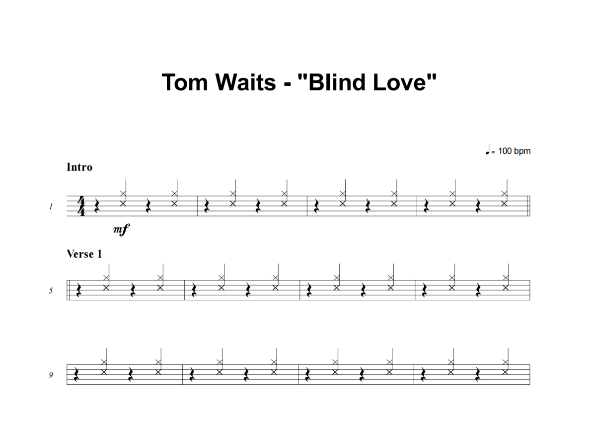 《Blind Love》是Tom Waits演唱的一首歌曲,这份架子鼓谱共有四张高清图谱,图谱由 @积极处世 编配上传,图谱使用五线谱编配,使用这份Blind Love架子鼓谱,你将能够轻松地敲打出这首Tom Waits的Blind Love,快来尝试吧。