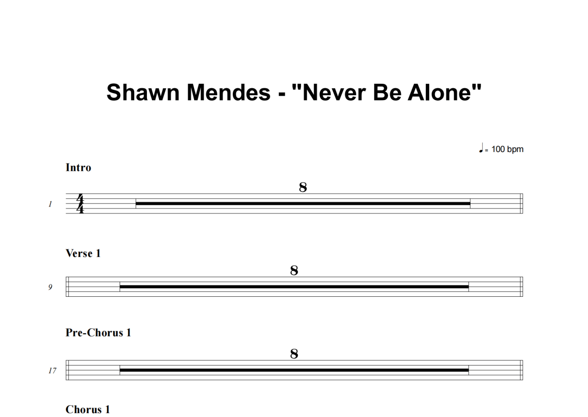 《Never Be Alone》是Shawn Mendes演唱的一首歌曲,这份架子鼓谱共有两张高清图谱,图谱由 @积极处世 编配上传,图谱使用五线谱编配,使用这份Never Be Alone架子鼓谱,你将能够轻松地敲打出这首Shawn Mendes的Never Be Alone,快来尝试吧。