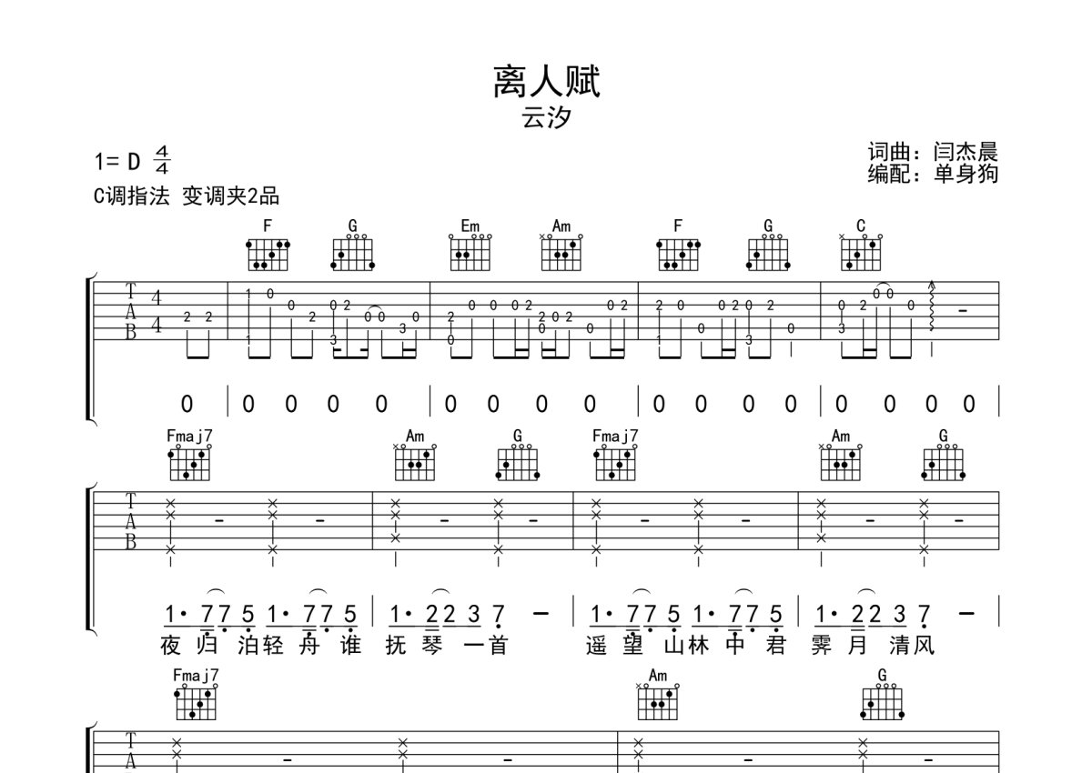 《离人赋》是云汐演唱的一首歌曲,本吉他谱采用的是C调指法编配,这份吉他谱共有三张高清图谱,图谱由 @单身狗 编配上传,图谱使用六线谱编配,包含吉他和弦指法、简谱以及歌词部分,使用这份离人赋吉他谱,可以让你更加方便地掌握这首歌曲的弹唱技巧,快来尝试吧。云汐《离人赋》吉他弹唱谱,采用C调指法编配,单身狗编配出品,共有3张高清图谱。