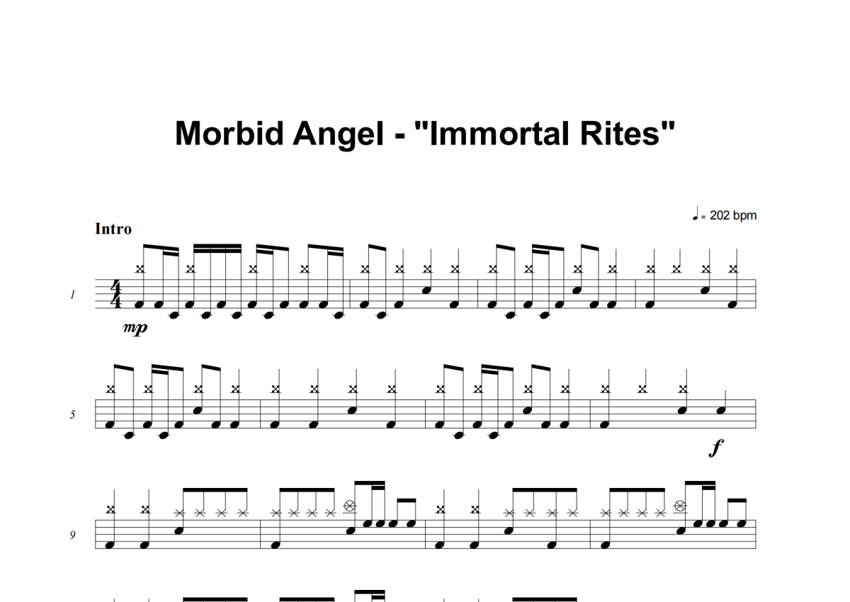 《Immortal Rites》是Morbid Angel演唱的一首歌曲,这份架子鼓谱共有八张高清图谱,图谱由 @积极处世 编配上传,图谱使用五线谱编配,使用这份Immortal Rites架子鼓谱,你将能够轻松地敲打出这首Morbid Angel的Immortal Rites,快来尝试吧。