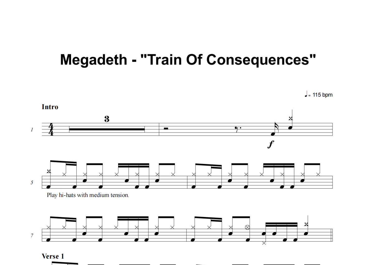 《Train Of Consequences》是Megadeth演唱的一首歌曲,这份架子鼓谱共有六张高清图谱,图谱由 @积极处世 编配上传,图谱使用五线谱编配,使用这份Train Of Consequences架子鼓谱,你将能够轻松地敲打出这首Megadeth的Train Of Consequences,快来尝试吧。