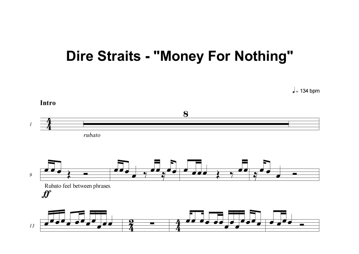 《Money For Nothing》是Dire Straits演唱的一首歌曲,这份架子鼓谱共有五张高清图谱,图谱由 @积极处世 编配上传,图谱使用五线谱编配,使用这份Money For Nothing架子鼓谱,你将能够轻松地敲打出这首Dire Straits的Money For Nothing,快来尝试吧。