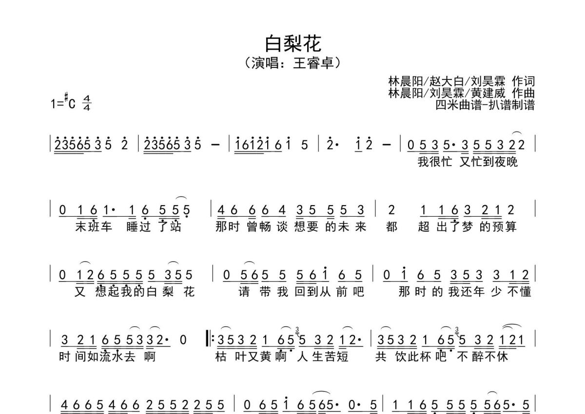 《白梨花》是王睿卓演唱的一首歌曲,拍号为4/4拍,这份简谱共有两张高清图谱,图谱由 @SRV7758521 编配上传。