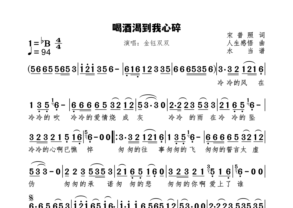 《喝酒渴到我心碎》是金钰双双演唱的一首歌曲,拍号为4/4拍,歌曲速度为每分钟94拍,这份简谱共有一张高清图谱,图谱由 @水当 编配上传原调bB。