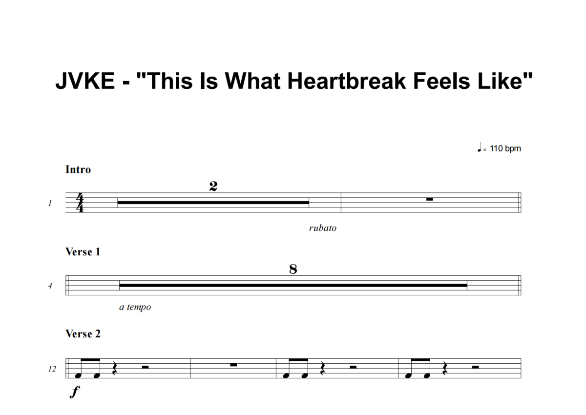 《This Is What Heartbreak Feels Like》是Jvke演唱的一首歌曲,这份架子鼓谱共有两张高清图谱,图谱由 @庄颜 编配上传,图谱使用五线谱编配,使用这份This Is What Heartbreak Feels Like架子鼓谱,你将能够轻松地敲打出这首Jvke的This Is What Heartbreak Feels Like,快来尝试吧。