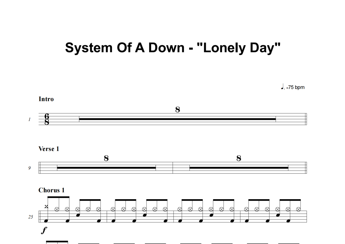 《Lonely Day》是System Of A Down演唱的一首歌曲,这份架子鼓谱共有三张高清图谱,图谱由 @庄颜 编配上传,图谱使用五线谱编配,使用这份Lonely Day架子鼓谱,你将能够轻松地敲打出这首System Of A Down的Lonely Day,快来尝试吧。
