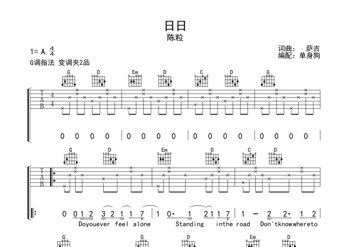 陈粒《日日》吉他谱 - G调弹唱六线谱