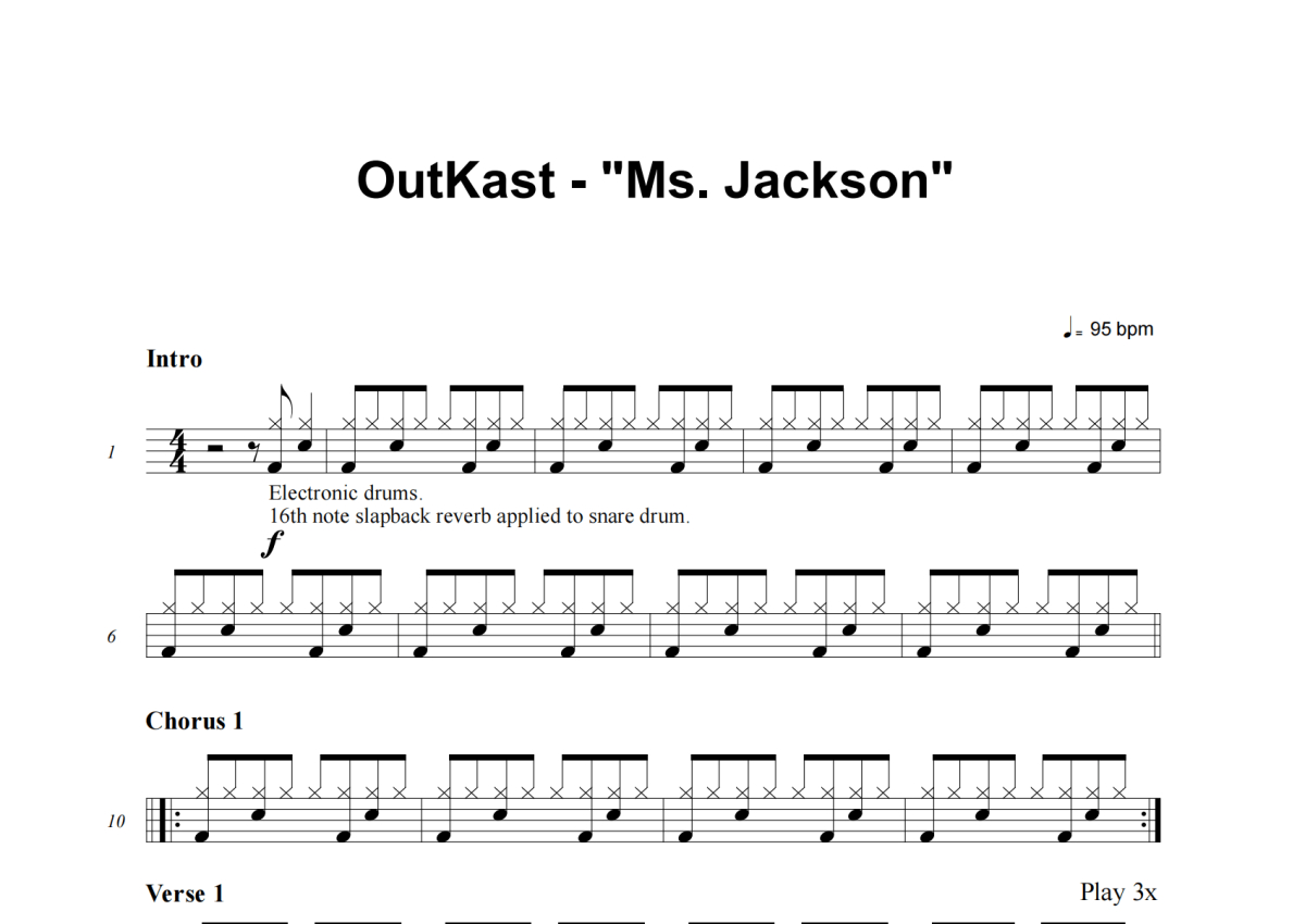 《Ms. Jackson》是OutKast演唱的一首歌曲,这份架子鼓谱共有两张高清图谱,图谱由 @庄颜 编配上传,图谱使用五线谱编配,使用这份Ms. Jackson架子鼓谱,你将能够轻松地敲打出这首OutKast的Ms. Jackson,快来尝试吧。
