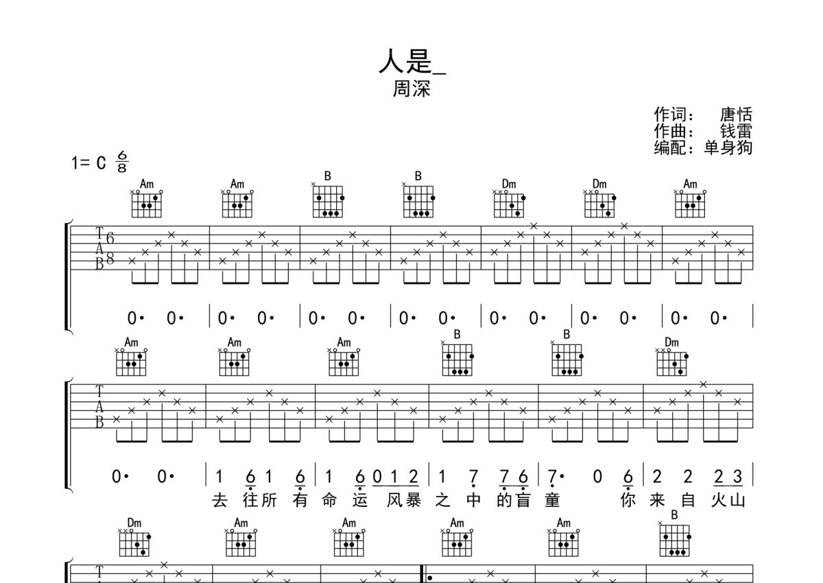 周深《人是》吉他谱 - C调弹唱六线谱