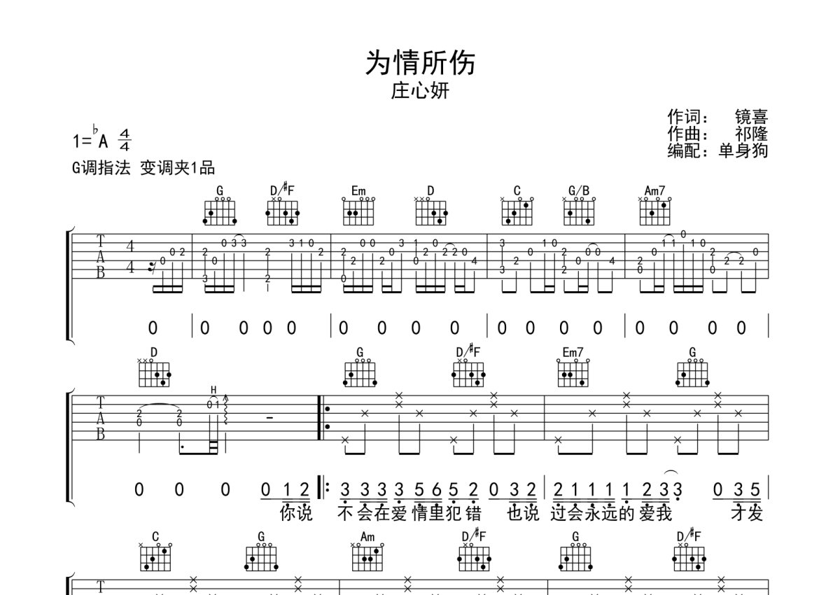 《为情所伤》是庄心妍演唱的一首歌曲,本吉他谱采用的是G调指法编配,这份吉他谱共有两张高清图谱,图谱由 @单身狗 编配上传,图谱使用六线谱编配,包含吉他和弦指法、简谱以及歌词部分,使用这份为情所伤吉他谱,可以让你更加方便地掌握这首歌曲的弹唱技巧,快来尝试吧。庄心妍《为情所伤》吉他弹唱谱,采用G调指法编配,单身狗编配出品,共有2张高清图谱,免翻页排版设计。