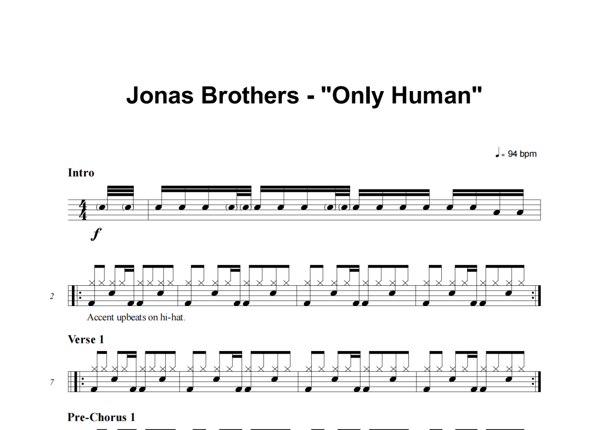 《Only Human》是Jonas Brothers演唱的一首歌曲,这份架子鼓谱共有两张高清图谱,图谱由 @庄颜 编配上传,图谱使用五线谱编配,使用这份Only Human架子鼓谱,你将能够轻松地敲打出这首Jonas Brothers的Only Human,快来尝试吧。