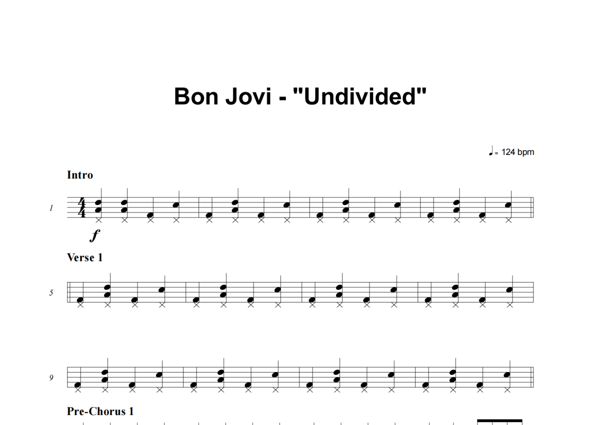 《Undivided》是Bon Jovi演唱的一首歌曲,这份架子鼓谱共有四张高清图谱,图谱由 @庄颜 编配上传,图谱使用五线谱编配,使用这份Undivided架子鼓谱,你将能够轻松地敲打出这首Bon Jovi的Undivided,快来尝试吧。