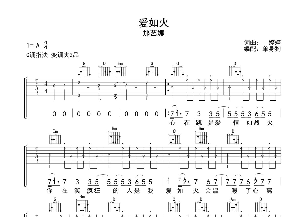 《爱如火》是那艺娜演唱的一首歌曲,本吉他谱采用的是G调指法编配,这份吉他谱共有三张高清图谱,图谱由 @单身狗 编配上传,图谱使用六线谱编配,包含吉他和弦指法、简谱以及歌词部分,使用这份爱如火吉他谱,可以让你更加方便地掌握这首歌曲的弹唱技巧,快来尝试吧。那艺娜《爱如火》吉他弹唱谱,采用G调指法编配,单身狗编配出品,共有3张高清图谱。