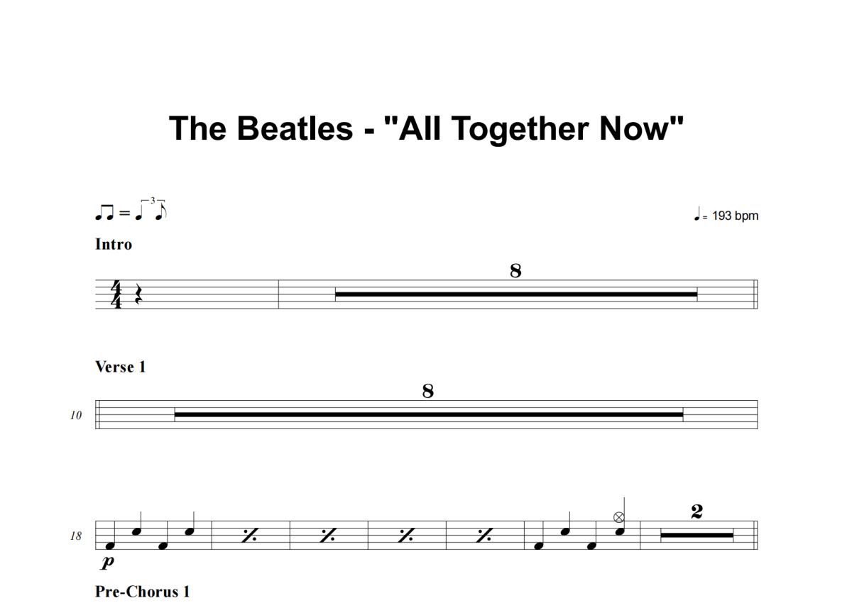 《All Together Now》是The Beatles演唱的一首歌曲,这份架子鼓谱共有三张高清图谱,图谱由 @庄颜 编配上传,图谱使用五线谱编配,使用这份All Together Now架子鼓谱,你将能够轻松地敲打出这首The Beatles的All Together Now,快来尝试吧。